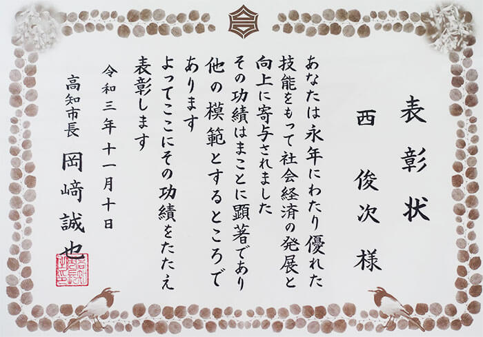 高知市では毎年約10名ほどが選出され、令和3年度高知市技能功労者表彰において、弊社代表の西俊次が表彰されました。