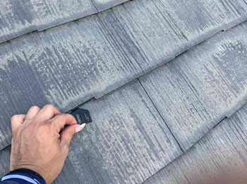 塗料に因る屋根材の密着を防ぎ排水口確保の為、屋根の縁切り作業を行っています。使用材料はタスペーサーです。