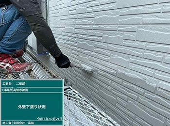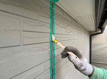 外壁(サイディング)の下塗り塗装を行っています。使用材料はカチオン架橋型アクリル樹脂シーラー(パワーシーラー)です。
