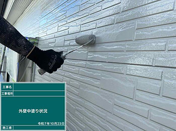 外壁(サイディング)の中塗り塗装を行っています。使用材料はシリコン樹脂塗料(マックスシールド1500Si-JY)です。