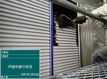 戸袋の塗装を行っています。使用材料はシリコン樹脂塗料(マックスシールド1500Si-JY)です。