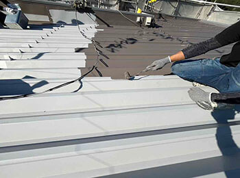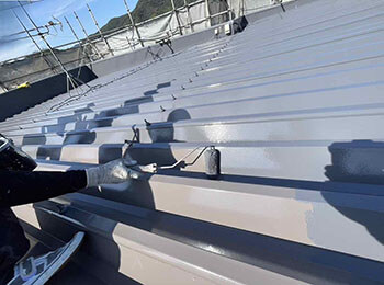 金属屋根(折半屋根)の下塗り作業を行っています。使用材料は弱溶剤系2液型変性エポキシ樹脂プライマー(エポックマイルド#2000N)です。