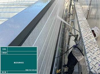 外壁(金属サイディング)の高圧洗浄を行っています。