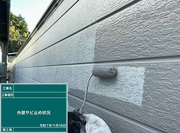 外壁(金属サイディング)の下塗り作業を行っています。使用材料は弱溶剤系2液型変性エポキシ樹脂プライマー(エポックマイルド#2000N)です。