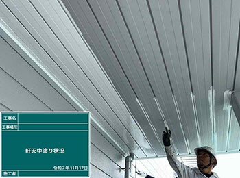軒天井の塗装を行っています。使用材料は(NADアクリル樹脂塗料(ビルディック)です。