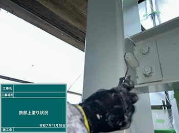 階段鉄部の塗装作業を行っています。使用材料はシリコン樹脂塗料(マックスシールド1500Si-JY)です。