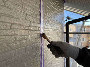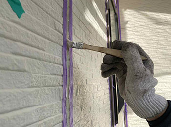 外壁目地のシーリング打替作業(プライマー塗布)を行っています。