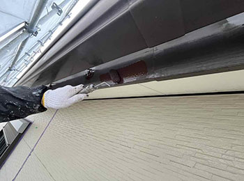 鼻隠しの塗装作業を行っています。使用材料はシリコン樹脂塗料(マックスシールド1500Si-JY)です。
