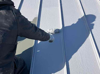 屋根の上塗作業を行っています。使用材料はシリコン樹脂塗料(断熱セラミックガイナ)です。