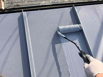 屋根の中塗作業を行っています。使用材料はシリコン樹脂塗料(断熱セラミックガイナ)です。