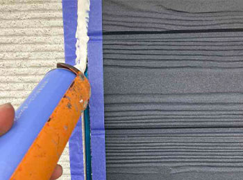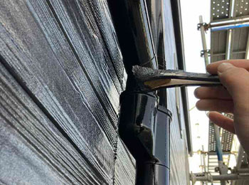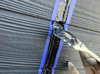 外壁目地シーリングの打替(ヘラ押さえ)作業を行っています。