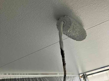 軒天井の塗装を行っています。使用材料はNADアクリル樹脂塗料(ビルディック)です。
