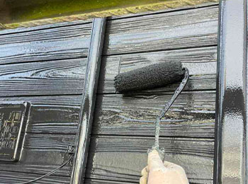 外壁の上塗を行っています。使用材料は無機塗料(無機UVコート)です。