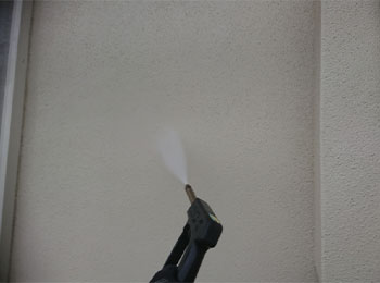 外壁の下塗作業を行っています。使用材料はカチオン架橋型アクリル樹脂シーラー(パワーシーラー)です。