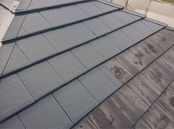 屋根(モニエル瓦)の中塗作業を行っています。使用材料は無機塗料(無機UVコート)です。