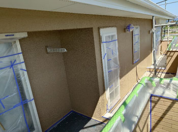 外壁の上塗を行っています。使用材料はフッソ樹脂塗料(フッソUVコートⅡ)です。