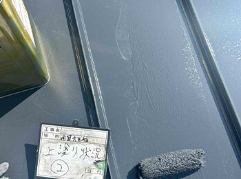 屋根(ガルバリウム鋼板)の中塗作業を行っています。使用材料はフッソ樹脂塗料(フッソUVコートⅡ遮熱)です。
