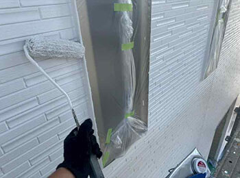 外壁(サイディング)の上塗作業を行っています。使用材料は無機塗料(無機UVコート)です。