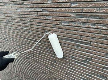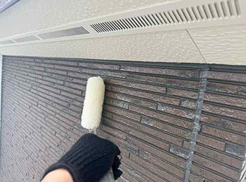 外壁(サイディング)の下塗作業を行っています。使用材料は無機塗料(無機UVクリヤーコート)です。