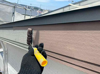 破風板の塗装作業を行っています。使用材料はシリコン樹脂塗料(マックスシールド1500Si-JY)です。